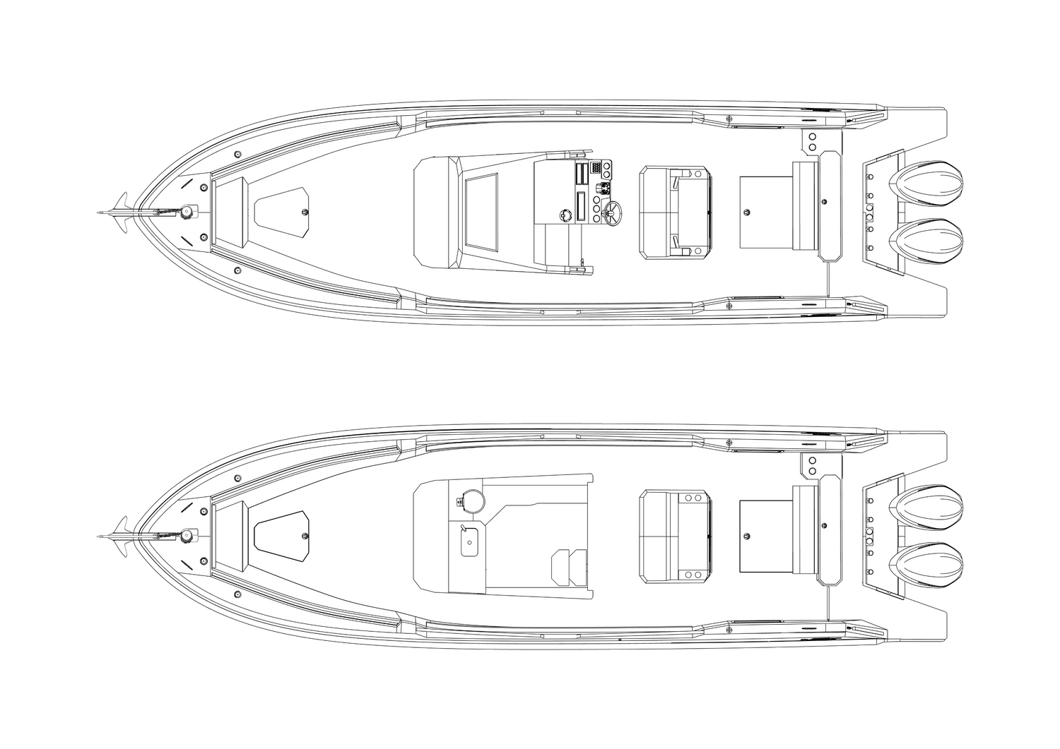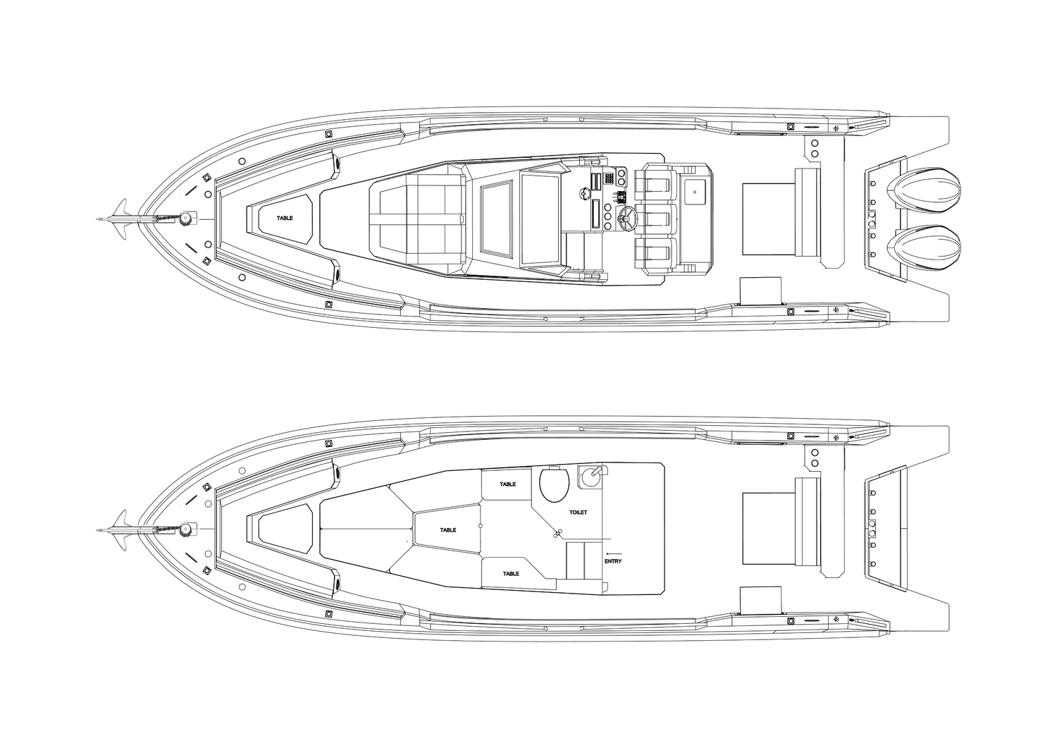 The Hull is designed to plane early from zero till forty-five knots in just five seconds. Achievable with maximum power of 3 engines with a total output of 1050 Horsepower and able to reach forty-five knots with 2 engines with a total output of 300 Horsepower.